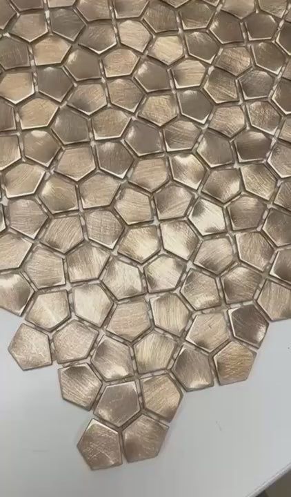 Op zoek naar hexagon mozaïek dat uw ruimte een exclusieve look kan geven. Dan is het Grazy Pattern Gold 300x300x6mm Mozaïek precies waar u naar op zoek bent. Het kleine formaat van dit mozaïek samen met de luxe look van de goud/bronzen kleur past perfect in interieurs die luxe uit moeten stralen. Dit mozaïek wordt verkocht en geleverd per matje. Wij leveren Grazy Pattern Gold 300×300