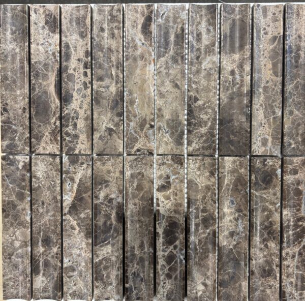 Het KitKat Conclave Marron Emperador mozaïek brengt de rijke uitstraling van Emperador-marmer samen met diepe bruintinten en een subtiele travertinlook. De smalle, verticale KitKat-vorm geeft dit mozaïek een moderne en verfijnde uitstraling. Perfect geschikt om warmte en luxe toe te voegen aan elke ruimte, of het nu gaat om een accentwand in de badkamer, keuken of woonkamer.