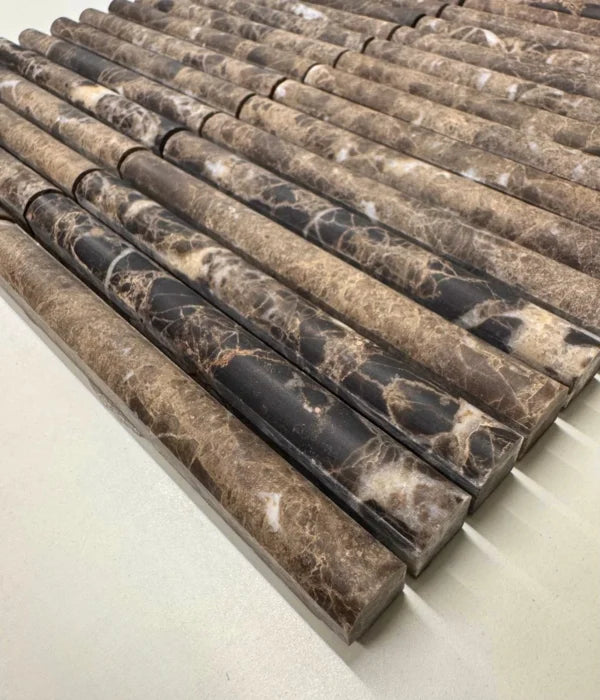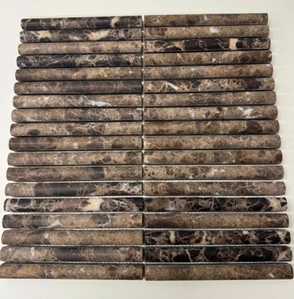 Het KitKat Marron Emperador Bull Nose mozaïek is vervaardigd uit hoogwaardig Marron Emperador-marmer en afgewerkt met een gezoete finish voor een subtiel matte glans. Dankzij onze precisiebewerking met eigen freesmachines is de afwerking strak en foutloos. Dit mozaïek leent zich perfect voor stijlvolle randen, verfijnde accenten en luxe wandtoepassingen. Elke doos bevat één matje van 30 × 30 cm.