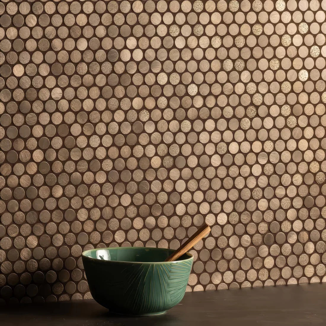 De Aluminium Penny Round mozaïektegels in brons hebben een doorsnede van 19 mm per tegel. Dankzij hun compacte formaat en elegante uitstraling zijn ze perfect geschikt voor wandtoepassingen. Ideaal om extra sfeer en stijl toe te voegen aan keukens of woonruimtes. De tegels zijn vervaardigd uit hoogwaardig aluminium en metaal en hebben een moderne, matte afwerking die zorgt voor een eigentijdse en luxe uitstraling.