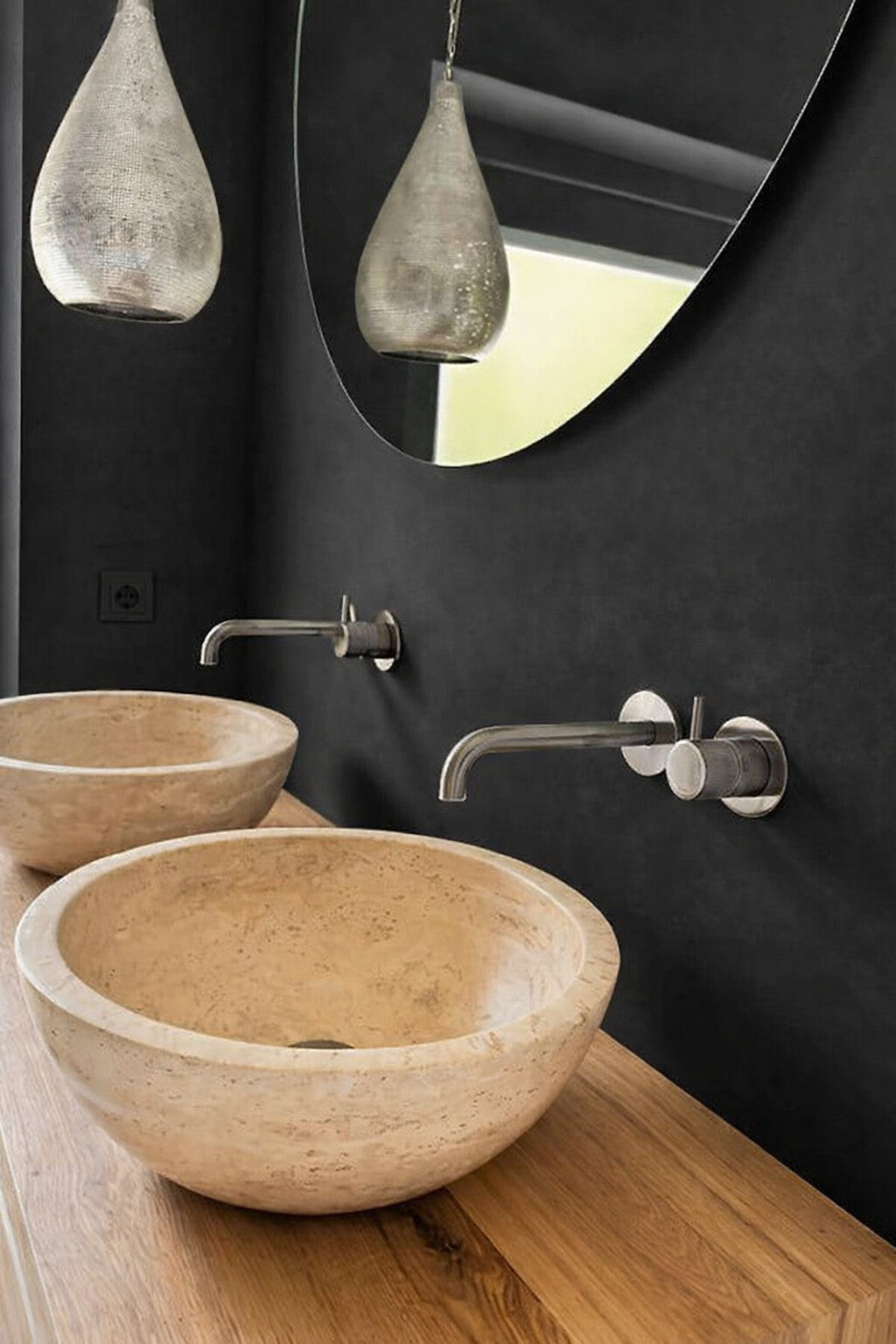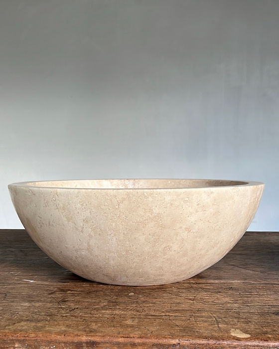 Elke waskom is vervaardigd uit één stuk travertin, wat zorgt voor een robuuste kwaliteit en een duurzame afwerking. De binnenzijde is glad afgewerkt voor optimaal gebruiksgemak, terwijl de subtiel gêmeleerde structuur aan de buitenzijde een verfijnde, natuurlijke uitstraling geeft.